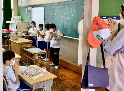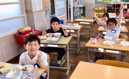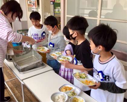 4月18日(金)の梅坪小(7)3年生の給食風景