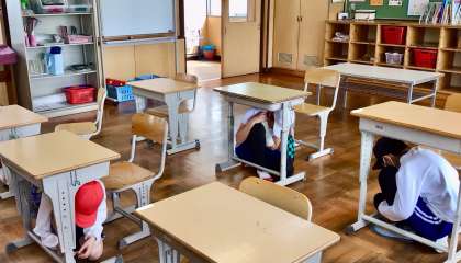 今日のねらいは、新しい教室からの避難経路をしっかり覚え、静かに避難すること、避難した子どもたちの人員点呼、安全確認を確実に行うことです。
