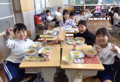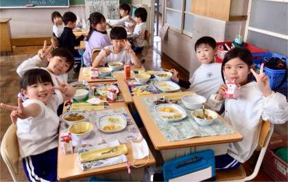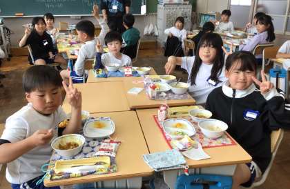 4月18日(金)の梅坪小(9)3年生の給食風景