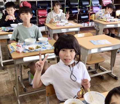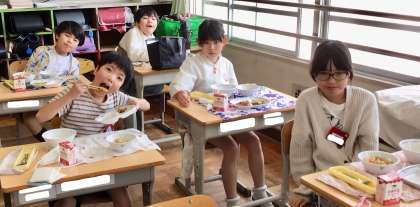 4月21日(月)の梅坪小(8)4年生の会食風景