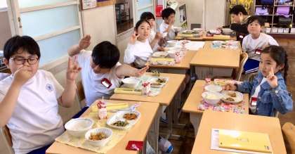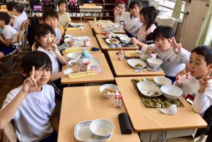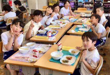 4月21日(月)の梅坪小(11)4年生の会食風景