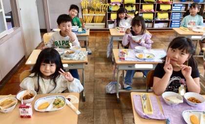 4月24日(木)の梅坪小(8)1年生の給食風景