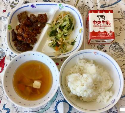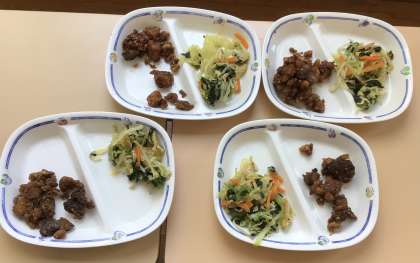 4月30日(水)の梅坪小(5)レバーと大豆の味噌がらめ ほか
