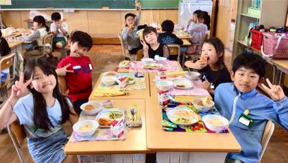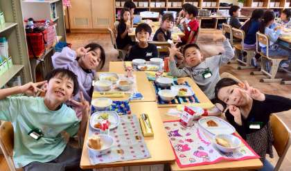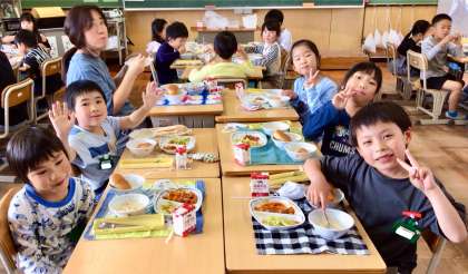 5月8日(木)の梅坪小(6)2年生の会食風景