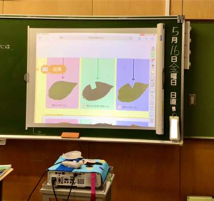 教師は、デジタル教科書を使って実験の様子をスクリーンに映し出しました。