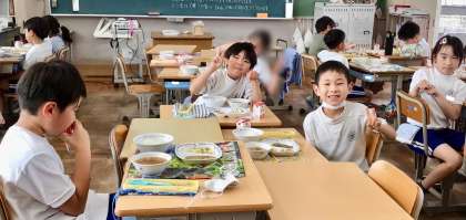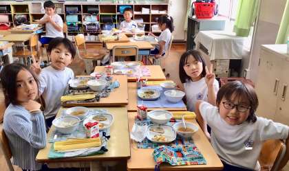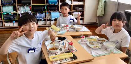 5月19日(月)の梅坪小(6)3年生の会食風景