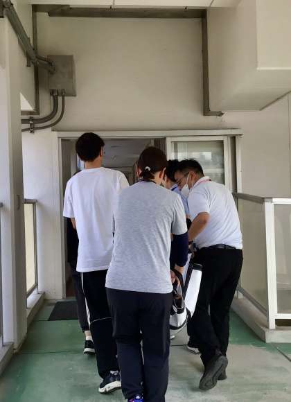 職員の役割分担を指示し、児童をビニール製の簡易担架で運びました。