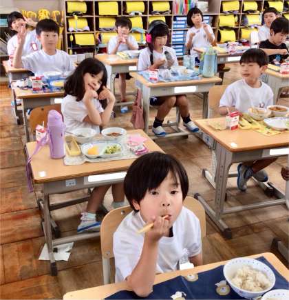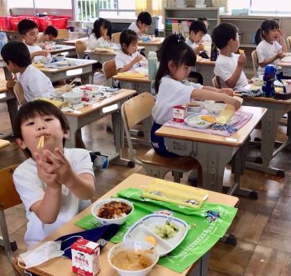 5月23日(金)の梅坪小(5)1年生の給食風景