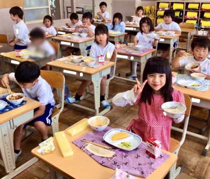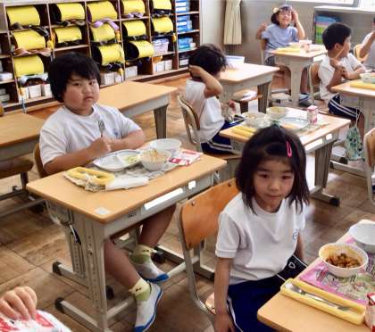 5月23日(金)の梅坪小(9)1年生の給食風景