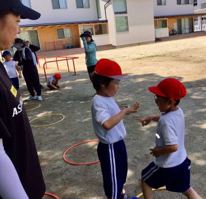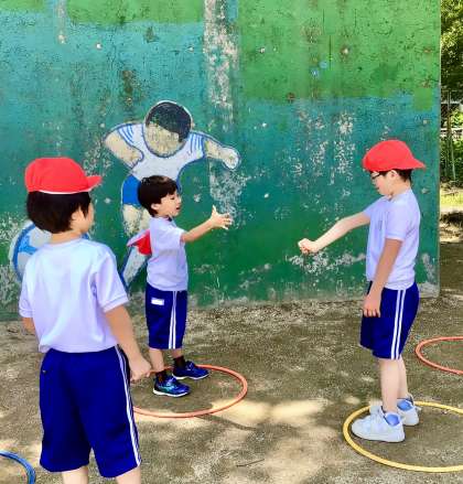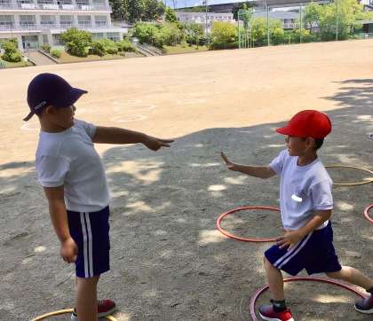 今日は、遊具の周回トレーニングのあと、日陰で輪っかを跳んで走り、じゃんけんをしました。