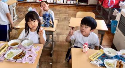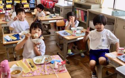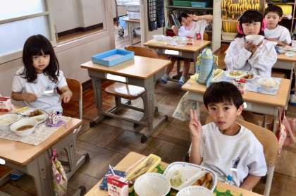 6月2日(月)の梅坪小(7)1年生の給食風景