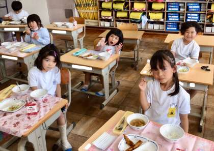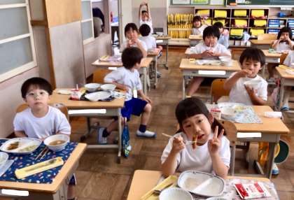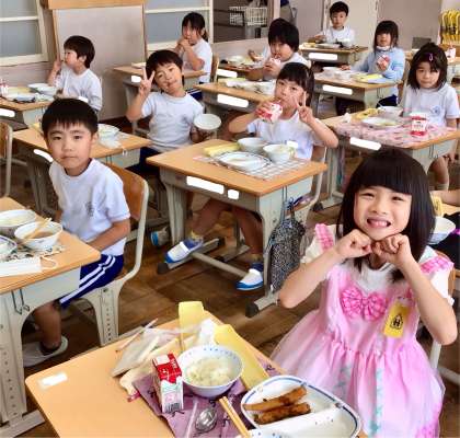 6月2日(月)の梅坪小(10)1年生の給食風景