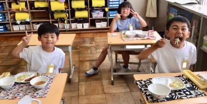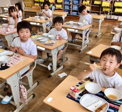 6月2日(月)の梅坪小(11)1年生の給食風景