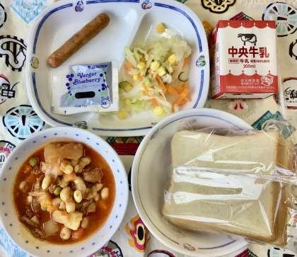 今日は、ポークビーンズにスライスパン。
