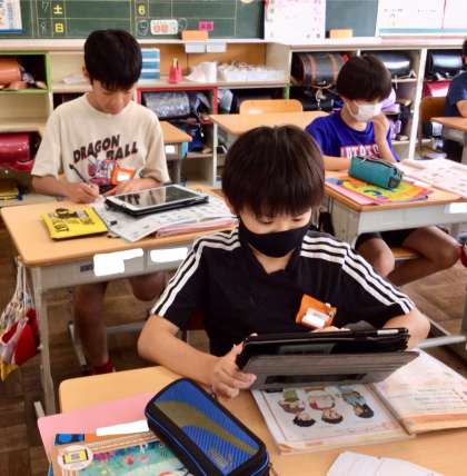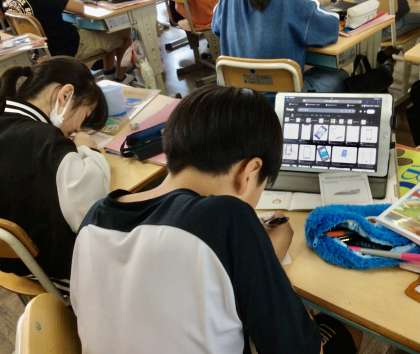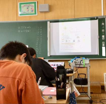 子どもたちは、デジタル教科書を見ながら、今日の英語表現に慣れていきました。
