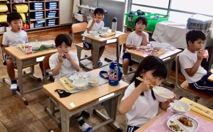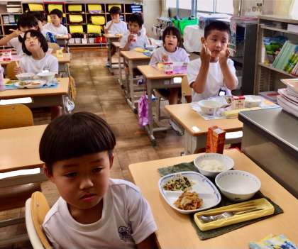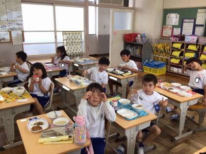 6月9日(月)の梅坪小(8)1年生の給食風景