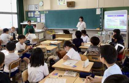 市役所の方をお招きし、パワーポイントを使って防災クイズを行っていました。