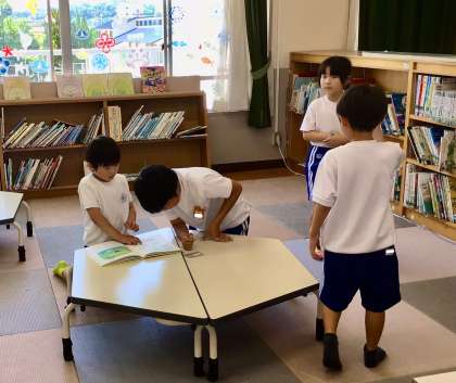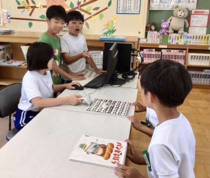 エアコンのきいた第1図書室では、5年生が1年生に本を選んだり、読んであげたりして一緒に楽しく過ごしていました。