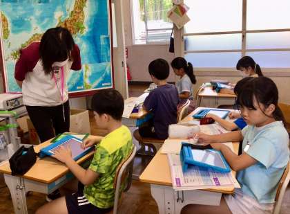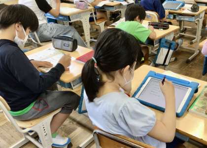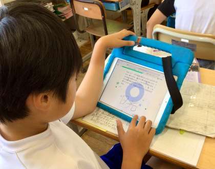 教師は、最後に タブレットのQubena(キュビナ)を使って、学んだことを定着させる「個別最適な学び」の場面を設けました。