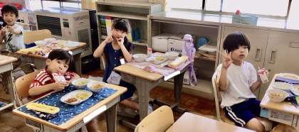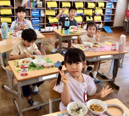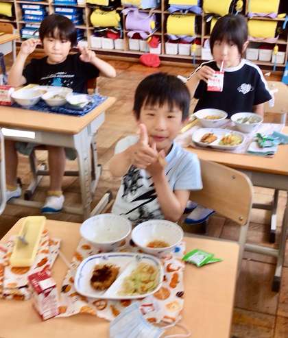 6月19日(木)の梅坪小(11)1年生の給食風景
