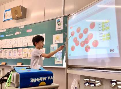 スクリーンの前に出て 指示棒を使って 英語で数えていく様子です!