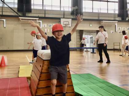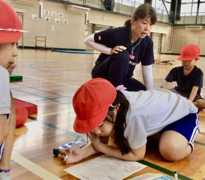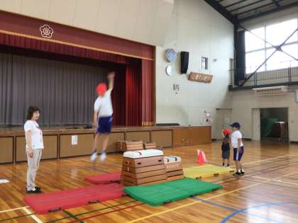 振り返りの場面では、自分の取り組みの態度や技のでき具合を記号で評価し、次回の授業でやってみたい技を書き込んでいました。^^