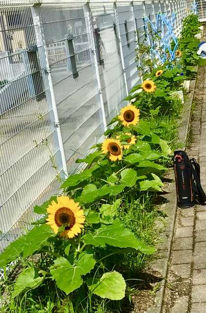 特別支援学級の畑の横の道。ひまわりロードになりました!