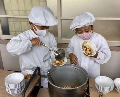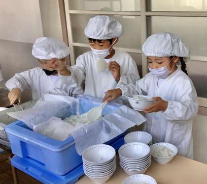 6月27日(金)の梅坪小(8)1年生の給食風景