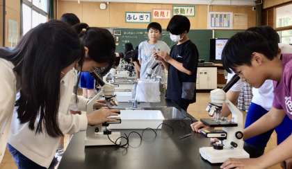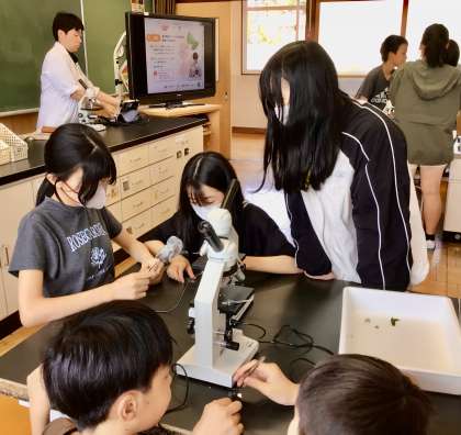 今日は、ホウセンカの葉をピンセットでめくって,透明な部分を顕微鏡で見ると,たくさんの「気孔」が見えました!