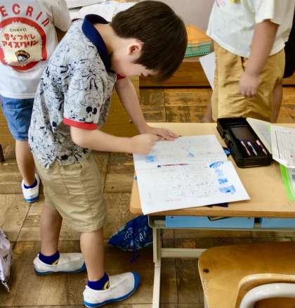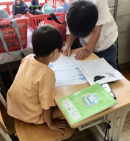 教え合う様子も見られ、書けたページは先生に見てもらっていました。