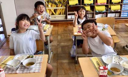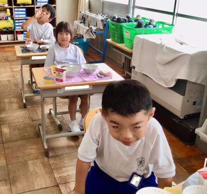7月7日(月)の梅坪小(10)1年生の給食風景