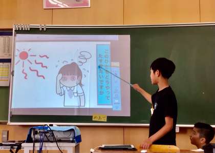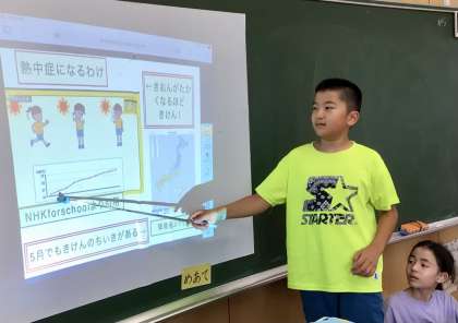 3人の子どもたちが、「熱中症」をテーマに、起こるわけ、どこで起こりやすいか、起こったらどうしたらいいか、起こらないようにするにはどうしたらいいか、など厳選した資料をパワーポイントのスライドにはりつけて、順序よく発表しました!