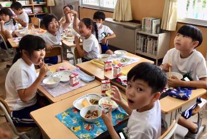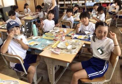 7月8日(火)の梅坪小(9)2年生の給食風景