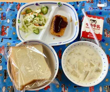 7月10日(木)の梅坪小(6)とうがんとベーコンのクリームスープ ほか!