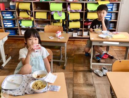 7月15日(火)の梅坪小(14)1年生の給食風景