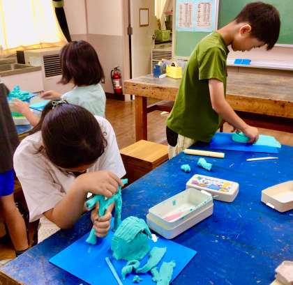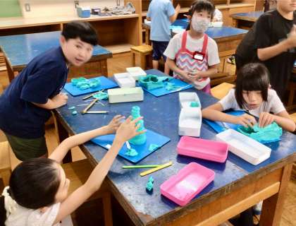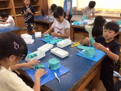 7月17日(木)の梅坪小(16)4年生 図工 粘土の板を立ち上げて