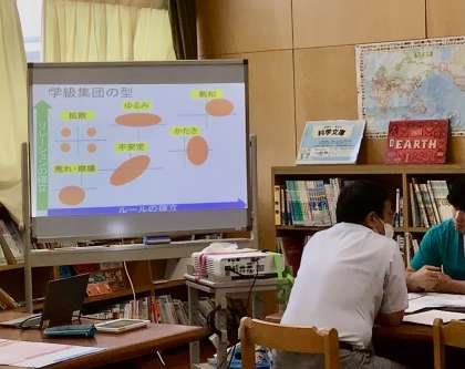 研修を受けたミドルリーダーの教師が中心となって、分析の仕方をパワーポイントで分かりやすくレクチャーし、担任たちは自分のクラスの状態を丁寧に分析、把握していました。