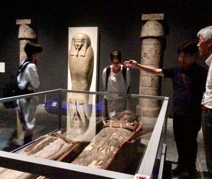 彫刻、棺、宝飾品、土器、パピルス、そして人間やネコのミイラなど約150点の遺物や迫力あるピラミッドの映像を通して、私たちの想像を超える高度な文化を創出した当時の人々の営みをひもといています。