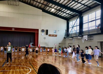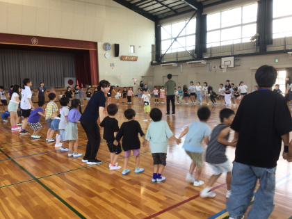 みんなで手をつないで大きな輪を作り、リーダーの合図に合わせて、前後左右に動きます!