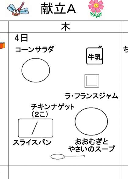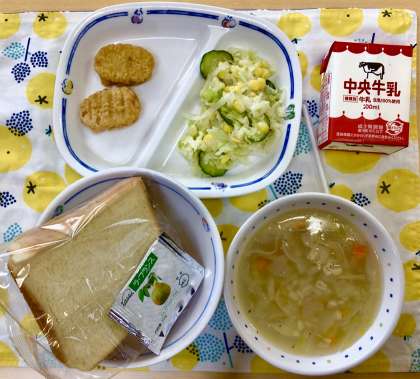 スープ、チキンナゲット、コーンサラダと充実のメニュー。