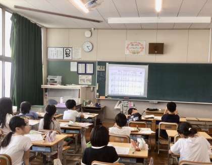 教師のタブレットからデジタル教科書の楽譜が投写され、子どもたちは 時折スクリーンに目を向けながら練習に励んでいました♪