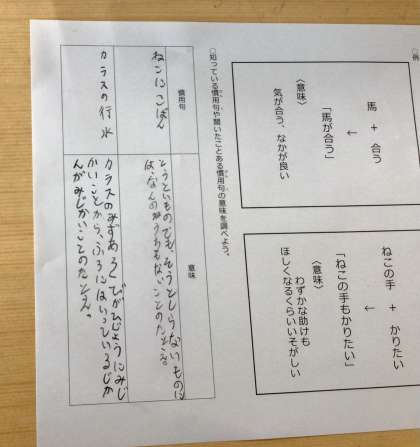 子どもたちは、国語辞典で自分だけが見つけた慣用句をワークシートに記入しました。