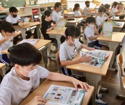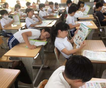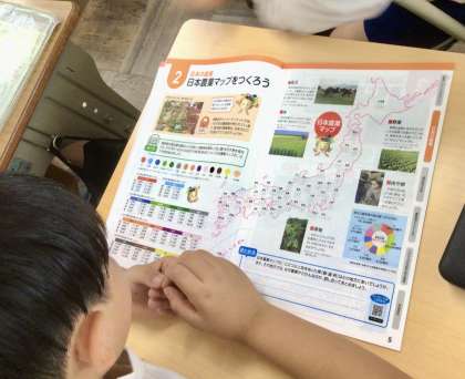 3組です。学活の時間に配られた日本の農業をまとめた冊子に目を通す子どもたち。