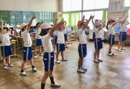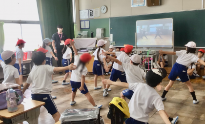 2組です。教師のタブレットにTeamsで送られた動画を投写しながら、みんなでスポフェスのダンスの練習をしています!