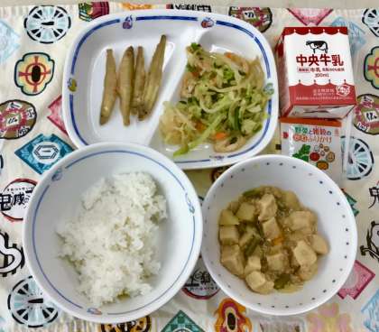 今日のメニューは、人気のこうや豆腐のうま煮に 香ばしいわかさぎのから揚げ、おひたしです。