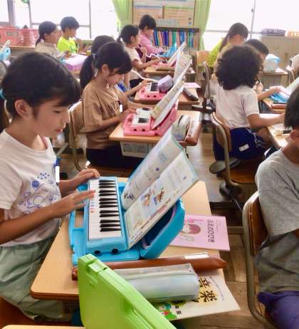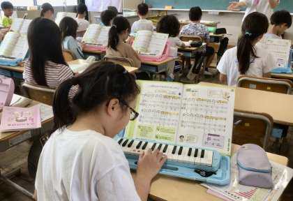 「2拍子のリズムにのって演奏しよう!」をめあてにして、パートに分かれて鍵盤ハーモニカを吹いていました。