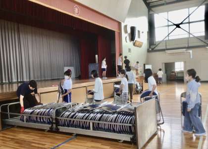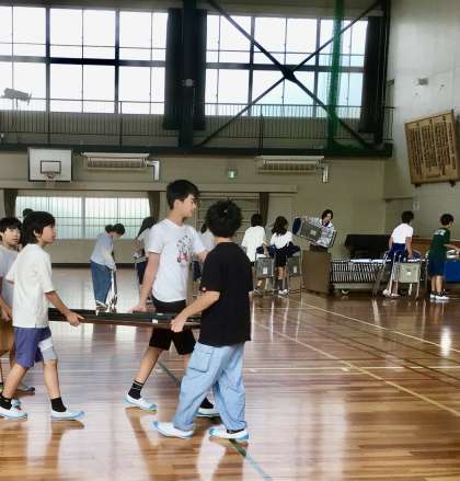 運営委員さんと、昨日の就学時健診の後片付けをする6年生。