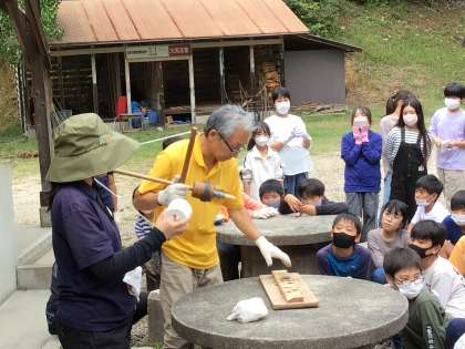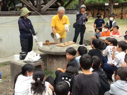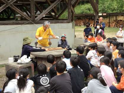 火おこし体験に入りました。みんな真剣に聞いています。