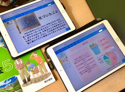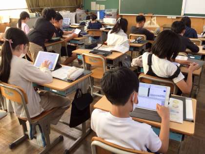 教科書や資料集などから、日本の食料自給率が低いことを知った子どもたちは、日本の食料生産にはどんな課題があり、どんな対策をうっていったらよいか について、学習用タブレットで調べていました。