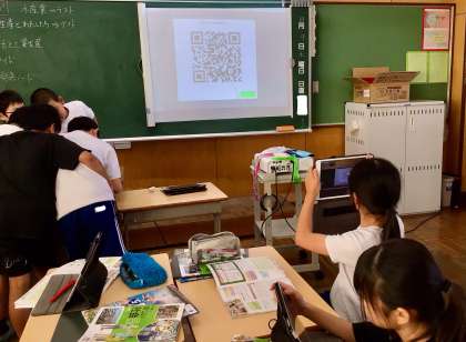 意見を可視化できる吹き出し状の付箋サービス、「ふきだしくん」のQRコードを学習用タブレットで読み取っているところです。